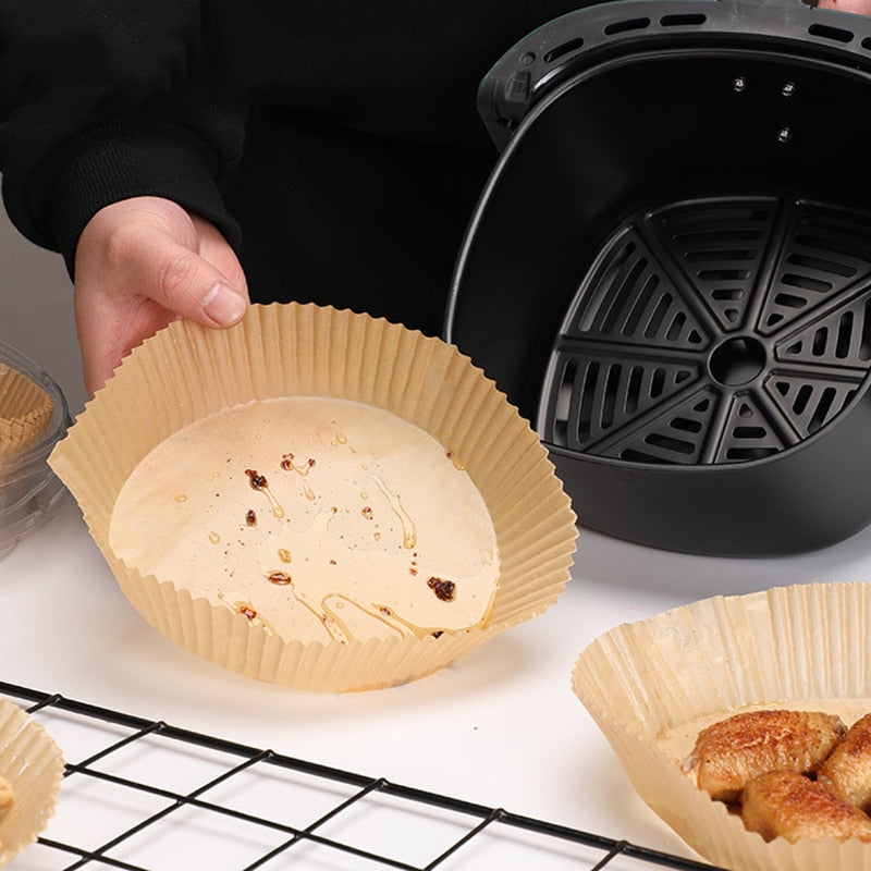 This 50pcs Air Fryer Disposable Paper Liner will keep your air fryer clean and save you time and effort. Made of food grade parchment, it is 100% healthy, waterproof, oil-proof, nonstick, and heat resistant enough to withstand temperatures up to 428 degrees Fahrenheit. It won't affect the taste of food either. The package comes with a generous supply of 50 pcs for every day usage needs. These liners are designed with a round bowl shape that requires no tearing, folding, cutting or bending—simply place it in the air fryer when you're ready to cook! With its 4.5cm wall protecting sides from unwanted residue build up, these paper liners are ideal for baking, roasting, frying or serving food at home. They are lightweight and practical enough to bring along on camping trips or BBQs and summer parties. Stop scraping off dried-on bits of food on your pots and pans now - order the 50pcs Air Fryer Disposable Paper Liner today!